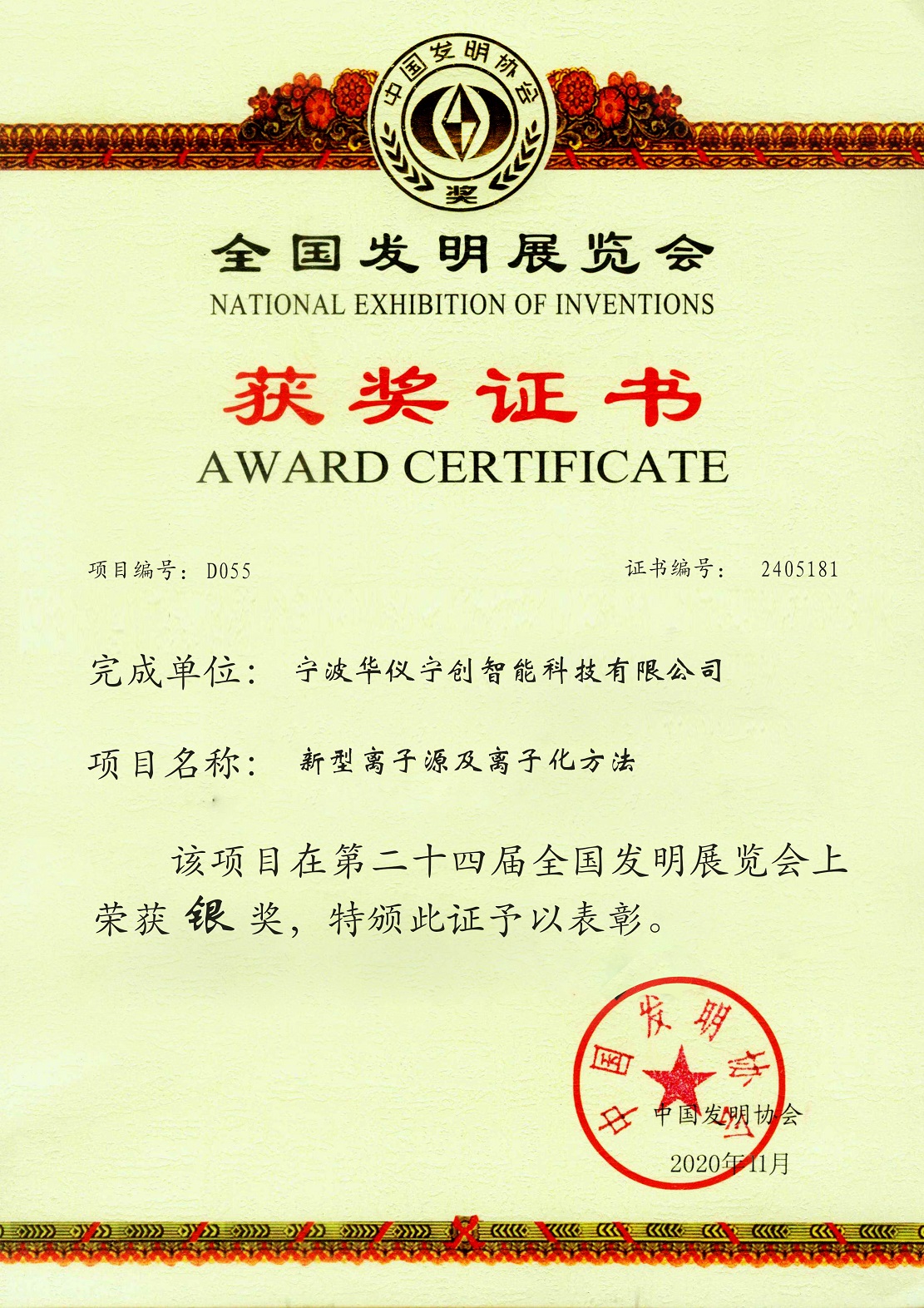 2020年11月21日,为期3天的第二十四届全国发明展览会——一带一路暨金砖国家技能发展与技术创新大赛在佛山闭幕。宁波华仪宁创智能科技有限公司参展发明专利“新型离子源及离子化方法”获得本届“发明创业奖”银奖。