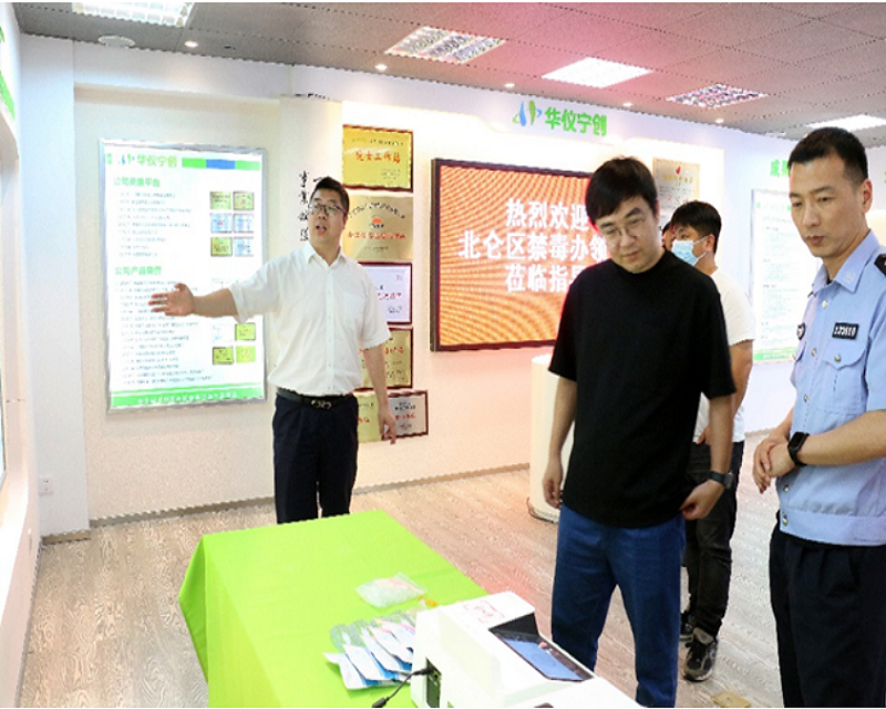 在听取汇报后,北仑区禁毒大队周奇荣警官对华仪宁创的自主创新代表成果表示高度认可,根据目前公安禁毒在一线实战中存在的技术问题,周警官与公司副总经理毕磊在会上展开细致讨论。通过熟悉华仪宁创在实战应用中的诸多成功案例,北仑区禁毒大队领导及禁毒社工代表对公司禁毒技术的创新发展有了更进一步的认识和了解。