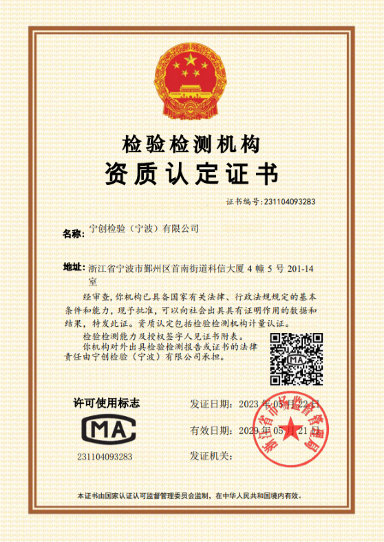近日,宁波华仪宁创智能科技有限公司(以下简称“华仪宁创”)全资子公司宁创检验顺利通过浙江省市场监督管理局检验检测机构资质评审,成功获得CMA资质认定证书。这是对华仪宁创硬件设施先进性、质量管理有效性以及检测人员专业性的充分肯定,标志着华仪宁创的检测水平迈上了一个全新台阶,能为用户提供更加专业且全面的检测服务。